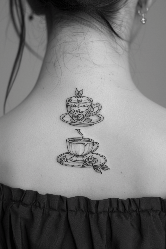 This neck tattoo features two stacked teacups, each adorned with delicate, whimsical designs reminiscent of the Mad Tea Party from Alice in Wonderland. The top cup is playfully tilted, giving the impression of movement, as if it might tip over at any moment. The designs on the cups include tiny flowers and leaves, with steam gracefully rising from the lower cup. The black and gray ink adds to the tattoo s subtle elegance.