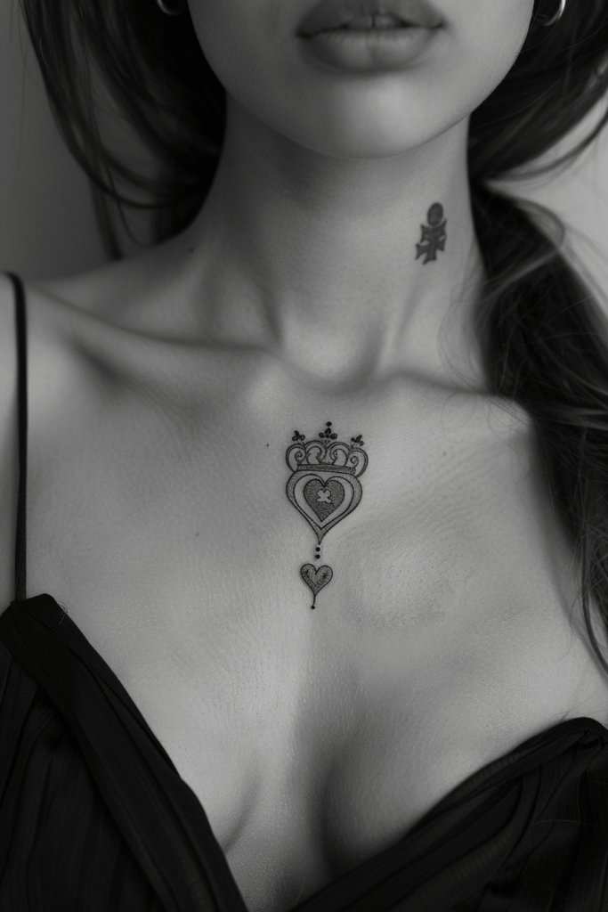 This tattoo, positioned elegantly on the sternum, features a stylized depiction of the Queen of Hearts, a key character from Alice in Wonderland. The design is minimalist, with three interconnected hearts that flow downward, each adorned with subtle royal embellishments like a crown and delicate filigree. The ink is black, which enhances the crisp, clean lines that define this tattoo.
