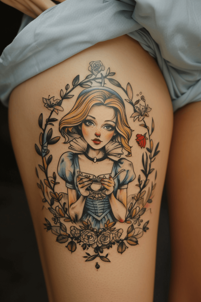 This thigh tattoo beautifully illustrates Alice from Alice in Wonderland, surrounded by a floral wreath. Alice is portrayed in a whimsical yet thoughtful pose, holding a pair of cards. Her expression is soft, and her eyes are detailed, giving a sense of curiosity and wonder. The tattoo is rich in shades of blue and earth tones, with red accents on the roses that add a pop of color. The use of fine lines and subtle shading gives the image depth and a delicate feel.