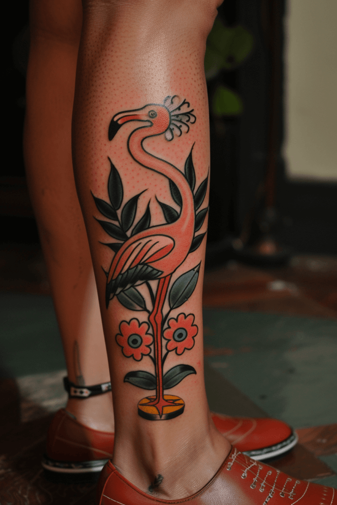 This tattoo, inked on the lower leg, features a stylized flamingo from Alice in Wonderland, known for its role in the quirky croquet scene. The design combines bold colors and retro art style, presenting the flamingo in a striking red hue contrasted against vibrant green leaves and orange flowers.