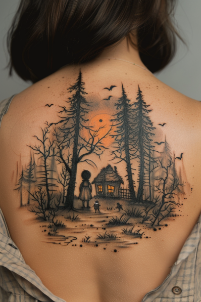 This stunning tattoo captures the eerie and enchanting atmosphere of Coraline perfectly. The central focus is a shadowy figure of Coraline herself, standing at the edge of a dark forest, staring toward a small, glowing house in the distance. The trees are tall and haunting, their branches bare and twisted, adding to the spooky vibe. Above, a glowing orange moon lights up the night, and several small bats fly through the sky, enhancing the eerie mood. The shading and detail in the trees and ground give the tattoo a beautifully textured, almost cinematic look.