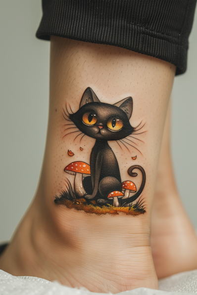 Cute Coraline Cat Tattoo with Mushrooms and Forest Charm