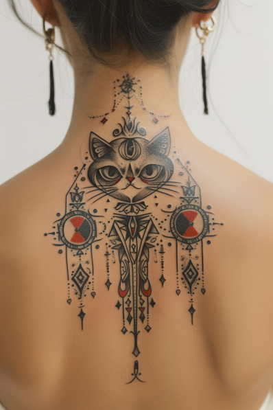 This tattoo beautifully merges Coraline s iconic black cat with bold geometric elements. The cat s face sits at the center, staring out with a sense of mystery, surrounded by intricate patterns that feel almost like ancient symbols. The design features symmetrical lines, circles, and diamond shapes, highlighted with subtle red accents that give it a modern yet mystical vibe. The placement on the neck adds an extra touch of elegance, making it a striking visual element that feels both artistic and meaningful.