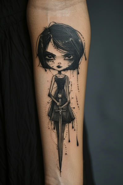 This tattoo presents Coraline in a bold, fierce way, holding a long sword with an intense expression that suggests she s ready for battle. The black and gray ink gives the piece a dark, moody aesthetic, with ink splatters and fine dots adding a raw, edgy vibe. Coraline s large, focused eyes and sharp features are striking, while the minimalistic shading emphasizes her powerful stance. The dripping effect at the bottom and around her hair adds an artistic, almost unfinished quality, making it feel gritty and dynamic.