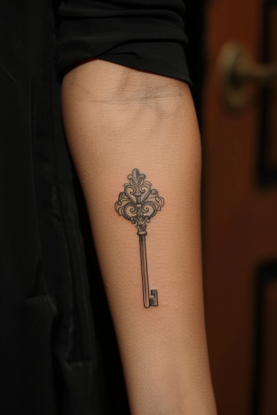 This tattoo brings one of the most iconic symbols from Coraline to life: the key. Done in a minimalist yet detailed vintage style, the key features intricate ornamental designs at the top, giving it an old-world charm. Its placement on the forearm makes it easily visible, yet the simplicity of the design ensures it doesn t overpower. The clean lines and lack of color keep the focus on the key s shape and detail, adding a subtle but meaningful element to your collection of body art.