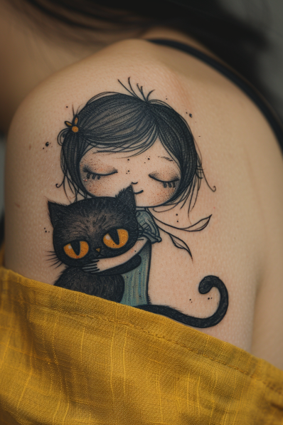 This adorable tattoo features a soft and sweet moment between Coraline and her beloved black cat. Coraline, with her eyes closed in a peaceful expression, hugs her cat tightly, giving the design a heartwarming and cozy feel. The cat s bright yellow eyes stand out beautifully against its dark fur, adding a pop of contrast to the otherwise soft, muted tones of the tattoo. The gentle shading, small details like the bow in Coraline s hair, and the overall simplicity of the design make this piece feel warm and intimate.