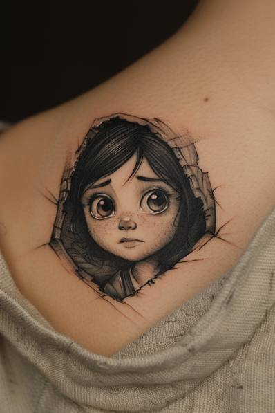 Realistic Coraline Portrait Tattoo with a 3D Effect