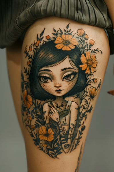 This tattoo features a beautifully stylized portrait of Coraline, framed by blooming orange flowers and delicate greenery. Coraline s wide eyes and soft expression are brought to life with intricate shading, while the flowers around her add a touch of warmth and nature. The balance between the muted tones in Coraline s face and the vibrant orange flowers gives this design a harmonious blend of soft and bold. The details in the flowers and leaves surrounding her create an almost enchanted garden atmosphere, making the piece feel magical and alive.
