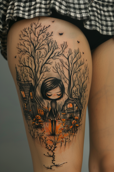 This tattoo captures Coraline in a spooky yet endearing style, standing in front of a haunted-looking house, framed by bare trees. The character is portrayed with a cute, minimalist design, her eyes closed as if in deep thought. The orange glow surrounding her gives the tattoo a warm, eerie vibe, contrasting beautifully with the dark, shadowy trees and gloomy buildings in the background. Small details like mushrooms growing near her feet and bats flying above add to the overall creepy-cute aesthetic that fans of the film will immediately recognize and love.