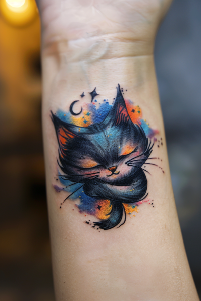 This tattoo captures Coraline s iconic cat in a dreamy, surreal style, surrounded by a swirl of watercolor hues. The cat, eyes closed and expression peaceful, is depicted with soft black fur and delicate shading, almost floating within a colorful cosmic backdrop of blues, oranges, and purples. Stars and a crescent moon add a celestial vibe, giving the design a magical, nighttime energy. The use of vibrant colors against the darker black lines creates a stunning contrast that makes this tattoo feel alive and full of wonder.