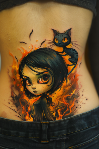 This vibrant tattoo features a striking depiction of Coraline and her black cat, surrounded by intense flames that create a dramatic, fiery backdrop. Coraline s eyes are large and captivating, with a determined expression that mirrors her fearless personality. The black cat sits perched on her shoulder, its yellow eyes glowing with curiosity, adding to the overall sense of mystery and adventure. The use of bold oranges, reds, and yellows in the flames contrasts beautifully with Coraline s dark hair and the cat s sleek fur, making this tattoo a real visual standout.