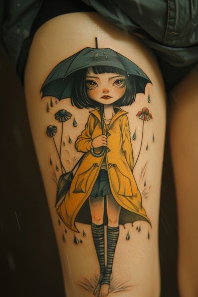 This tattoo features Coraline standing in the rain, holding an umbrella with her signature yellow raincoat. The design captures her iconic look with great attention to detail, from the striped socks to her slightly oversized coat. Raindrops and small, colorful flowers fall around her, adding a whimsical touch to the scene. The use of deep blues and bright yellows creates a stunning contrast, giving the tattoo both a vibrant and moody feel, perfectly reflecting Coraline s curious yet adventurous spirit.