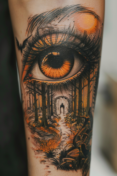 This forearm tattoo combines the magic and mystery of Coraline into a surreal masterpiece. The focal point is an intensely detailed orange eye that feels like it s watching your every move. Below, a shadowy forest unfolds, with a winding path leading to a distant, eerie figure standing at the entrance of a tunnel. The contrast between the vibrant eye and the dark, moody forest creates a captivating balance of warmth and suspense. The bat flying near the eye adds a small but significant nod to the spooky atmosphere of the film.
