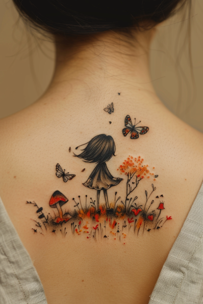 This tattoo beautifully captures a whimsical scene featuring Coraline in a dreamy landscape, surrounded by butterflies, flowers, and mushrooms. Coraline is depicted from behind, her dress swaying gently in the breeze, as if she s lost in the beauty of nature. The butterflies flutter around her, with delicate details on their wings. The mushrooms and wildflowers, in shades of red and orange, bring warmth to the design, creating a peaceful yet magical vibe. The overall composition is simple but full of life, as if Coraline is exploring a serene, enchanted meadow.