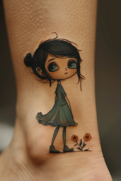 This tattoo is a delightful, minimalist rendition of Coraline herself, standing in her classic blue outfit, looking back with her iconic curious expression. The large green eyes give her a slightly whimsical look, while the delicate lines and soft colors make the design feel almost like an animated sketch. Below her feet, two tiny orange flowers add a pop of color and complete the charming vibe of this small, detailed tattoo. It s a simple, sweet tribute that manages to capture Coraline s spirit perfectly.