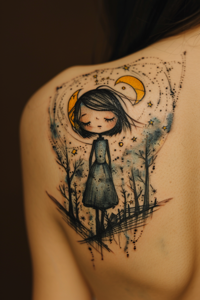 Dreamy Coraline Tattoo with Night Sky and Moon