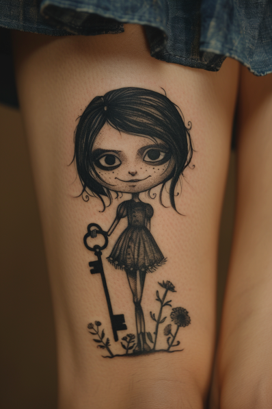Playful Coraline Tattoo Holding the Key with Whimsical Details