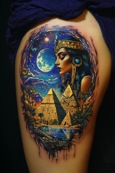 This breathtaking tattoo transports you straight into the heart of ancient Egypt, blending the beauty of Cleopatra with the magic of a starlit desert scene. Cleopatra s profile is illuminated by the ethereal glow of the full moon, her serene face exuding wisdom and strength. The pyramids stand tall and majestic, bathed in golden light, while the sky above swirls with vibrant shades of blue and purple, dotted with shimmering stars. Palm trees and reflections in the water add layers of depth and realism, making the whole piece feel like an enchanting nighttime dreamscape.