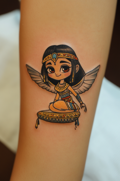 This adorable chibi Cleopatra tattoo adds a playful spin to the legendary queen, complete with charming cartoon features and tiny, outstretched wings. Her big, expressive eyes sparkle with curiosity, and her joyful smile radiates positivity. Dressed in a traditional yet simplified Egyptian outfit, she sits gracefully on a golden, patterned platform, giving off a sense of cheerful energy. The small wings behind her are a fun touch, making her feel like a tiny, magical guardian ready to spread good vibes wherever she goes.