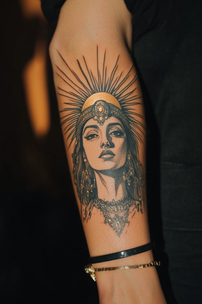 This powerful tattoo reimagines Cleopatra as the radiant Goddess of the Sun, combining her royal allure with celestial energy. Her fierce and dignified face is framed by an exquisite golden headdress, with rays of the sun bursting outward, creating a halo effect that radiates strength and divinity. The detailed adornments around her neck and shoulders exude an air of opulence, while her piercing gaze holds a mysterious wisdom. The interplay of bold black ink with shimmering gold accents makes this tattoo a breathtaking homage to her timeless majesty, infused with solar symbolism.