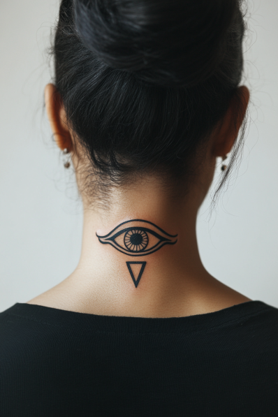 This striking tattoo features a bold and simplified Eye of Cleopatra design, positioned right at the nape of the neck for a mysterious and captivating vibe. The eye itself is crafted with smooth, precise lines, giving off an air of watchful wisdom, while a simple inverted triangle sits directly below, adding a modern and edgy twist to the ancient symbol. The overall look is sleek and powerful, emphasizing the eye s significance as a protective force and a timeless emblem of insight and strength.
