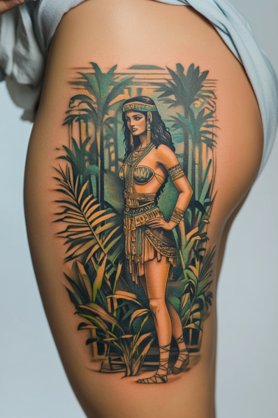This adventurous tattoo places Cleopatra in a lush jungle setting, portraying her as the fierce and commanding queen of the wilderness. Her confident stance, with one hand resting on her hip, exudes power and grace, while her outfit is richly adorned with golden accents, echoing the style of ancient Egyptian royalty. The background bursts with vibrant, detailed palm leaves and tropical greenery, creating a stunning contrast with Cleopatra s sun-kissed skin and intricate jewelry. The entire piece feels alive, as if Cleopatra herself is ready to conquer new territories, even deep within the wild.