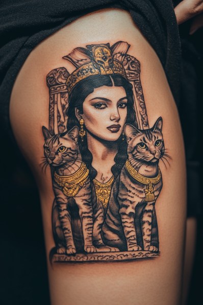 I ve got to say, this tattoo is a feline lover s dream with a historical twist! The way Cleopatra is portrayed alongside her feline companions emphasizes her authority and mystery while adding a touch of divine elegance. The cats aren t just accessories; they look ready to defend their queen or share in her wisdom. If you re someone who adores cats and appreciates the mystical allure of ancient Egypt, this tattoo is a powerful, eye-catching piece that ties both worlds together flawlessly. It s fierce, luxurious, and unapologetically regal.