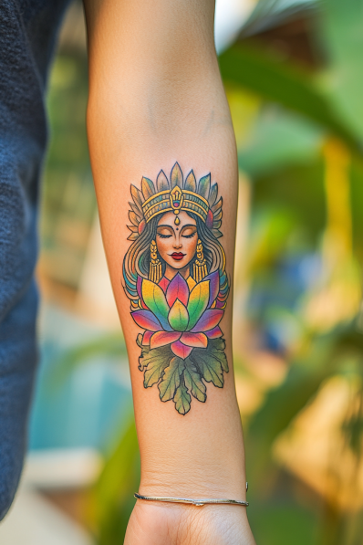This mesmerizing tattoo combines the regal beauty of Cleopatra with the serene symbolism of a blooming lotus. Cleopatra is depicted with a calm, meditative expression, her eyes gently closed, as if in a moment of deep peace and reflection. Her headdress is adorned with golden accents, and the lotus flower beneath her bursts with a spectrum of colors pinks, purples, blues, and greens creating a stunning gradient effect. The leafy details at the base of the flower add a natural touch, grounding the spiritual and royal elements of the design.