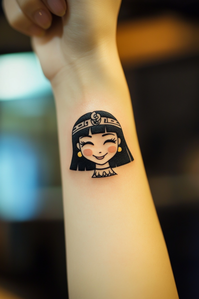 This playful cartoon Cleopatra tattoo is an absolute delight! With her cute, chubby cheeks flushed with a rosy blush and her wide smile that radiates pure happiness, this design captures a lighthearted, joyful version of the legendary queen. Her traditional headband and bob haircut are simplified yet still iconic, and her cheerful expression adds a youthful, fun vibe. The tattoo s small size makes it ideal for a subtle but meaningful spot, like the wrist, perfect for an everyday dose of positivity.