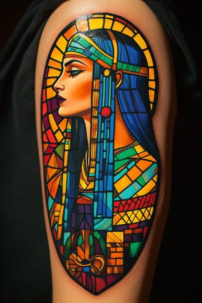 I can t get over how stunning and creative this tattoo is! It s like someone captured Cleopatra s spirit in a stained glass masterpiece and made it wearable. The colors are so striking, they look almost illuminated, and the way the artist played with light and shadow adds an incredible depth. It s the kind of tattoo that makes you stop and stare, maybe even do a double take. If you re into art that tells a story and love the idea of combining ancient history with bold, modern visuals, this tattoo is an absolute showstopper.