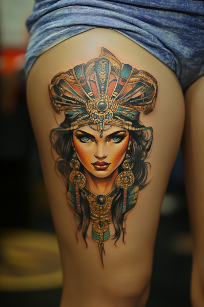 Honestly, this tattoo is a serious statement piece. It s bold, commanding, and makes you feel like you could conquer empires just by looking at it. The thigh placement gives it the perfect canvas to showcase all that stunning detail, and the color work is nothing short of phenomenal. This isn t just a tattoo it s wearable art that tells the world you re as powerful and fearless as Cleopatra herself. If you want ink that turns heads and starts conversations, this design does exactly that.