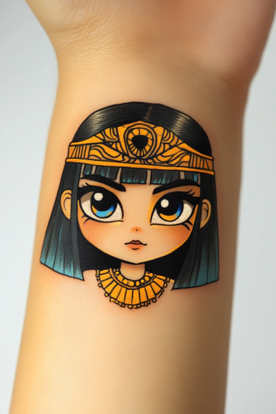 I absolutely love how this tattoo doesn t take itself too seriously but still manages to give off powerful Cleopatra energy. It s ideal for anyone who wants a more light-hearted, animated tribute to one of history s most famous rulers. Plus, it s small enough to work on places like the wrist but still packs a punch in personality. Honestly, if you re looking to add some ancient royalty to your ink collection with a smile, this chibi Cleopatra will melt hearts while holding her queenly ground.