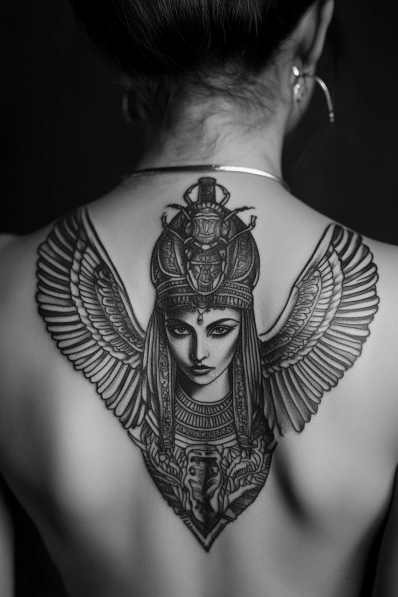 I m completely captivated by this tattoo it s not just art; it s a declaration. The placement across the back makes Cleopatra feel like a guardian spirit, watching over you with the elegance of a queen and the power of a goddess. The wings give off a sense of freedom and protection, and the scarab detail adds a mystical touch. It s perfect for someone who wants to carry a piece of ancient divinity and strength with them, making a bold impression wherever they go. Talk about a tattoo that commands attention and respect!