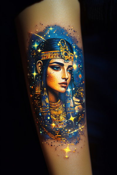 Honestly, this tattoo is out-of-this-world stunning. The blend of space elements with Cleopatra s iconic imagery makes for an ethereal and powerful piece. It s like she s a queen not just of Egypt but of the entire galaxy, radiating both wisdom and an otherworldly allure. The way the artist has intertwined the cosmic swirls with her royal accessories gives the impression that she s intertwined with the universe itself. If you want a tattoo that s both timeless and infinitely intriguing, this cosmic Cleopatra design will have everyone starstruck.