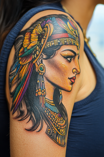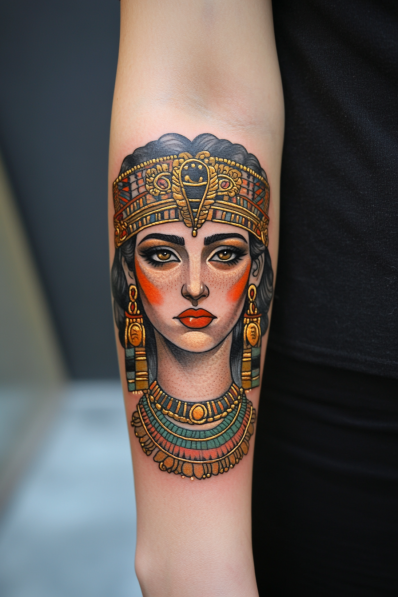 I have to say, I m blown away by the power and elegance this tattoo brings. It s not just a tribute to an ancient ruler but a straight-up work of art that screams confidence and royalty. The choice of warm, earthy tones combined with metallic highlights gives the whole design a sophisticated, timeless feel. Plus, the level of detail is jaw-dropping you can practically feel the weight of that jewelry! It s a perfect pick for anyone looking to embody strength, beauty, and an undeniable sense of authority. Cleopatra would definitely approve.