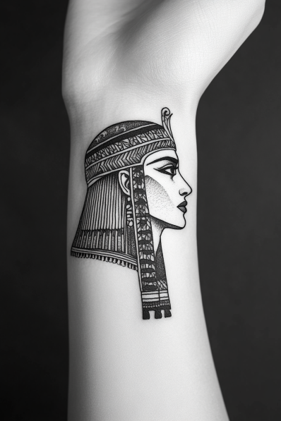 I have to admit, I m seriously impressed by how elegant this piece looks in its simplicity. The blackwork style makes it timeless, and there s something about having Cleopatra on your wrist that feels both protective and empowering. It s like wearing a constant reminder of strength and grace. Plus, the clean execution means it won t fade into obscurity as trends change. If you re into minimalist yet powerful tattoos, this is definitely one to consider. It s subtle enough for everyday life but holds a world of history and meaning.