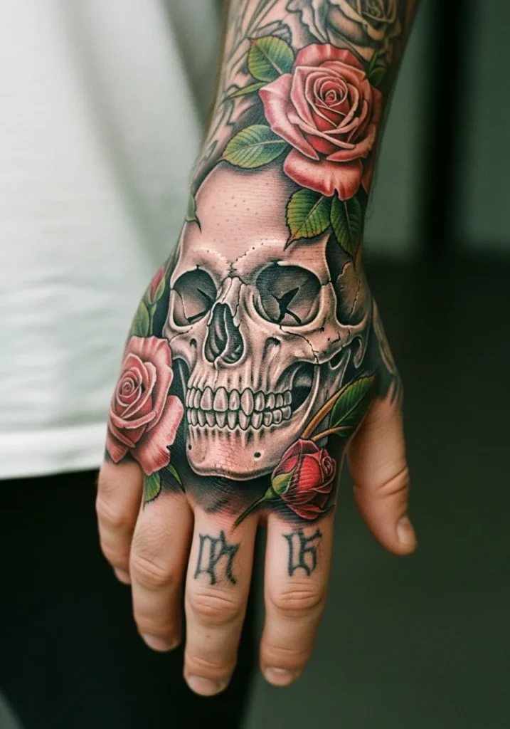 This striking hand tattoo combines a hyper-realistic skull surrounded by vivid red roses and lush green leaves. The artist plays with depth beautifully the skull s hollow eyes seem to sink beneath the skin while the roses burst forward in full bloom. Every petal, vein, and shadow is perfectly inked, creating a stunning 3D effect that commands attention.