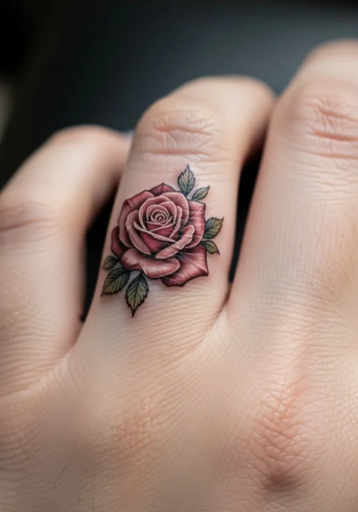 This petite rose tattoo sits beautifully on the finger, perfectly scaled for a minimal yet realistic floral statement. The soft burgundy petals and muted green leaves show off exquisite shading and precision every tiny detail contributes to its lifelike charm. It s subtle but far from ordinary.