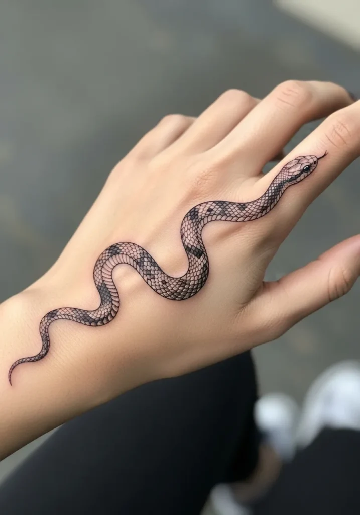 A slender black and grey snake winds gracefully across the hand in this fine line realism tattoo. The scales are meticulously detailed, and the body s natural curve flows perfectly along the fingers. The subtle shading gives it just the right amount of depth without overwhelming the skin.