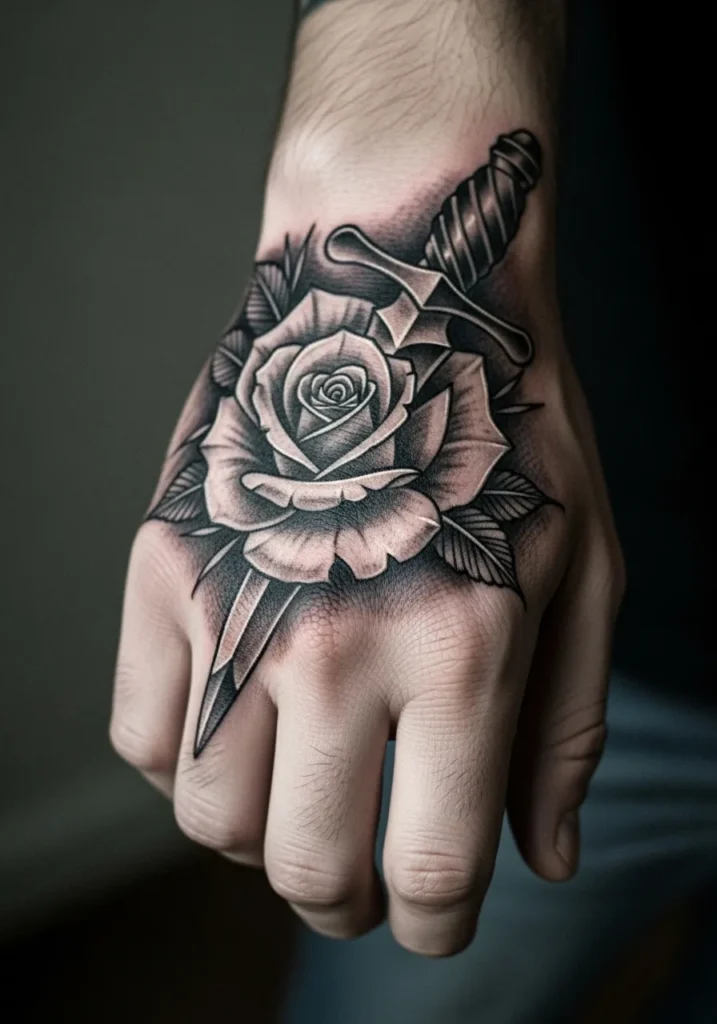 This bold hand tattoo features a detailed dagger piercing through a blooming rose. Done in black and grey realism, the artist captures every petal and metallic reflection with precision. The placement across the hand gives it a perfectly balanced look that draws the eye immediately.