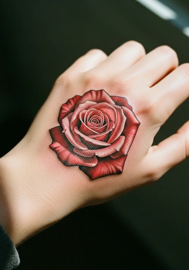 This design showcases a beautifully detailed red rose placed right at the center of the hand. The realism style captures every petal s soft curve, with gentle shading that brings the flower to life. The subtle highlights and natural skin texture make the tattoo look almost touchable, like a rose in full bloom resting on the skin.