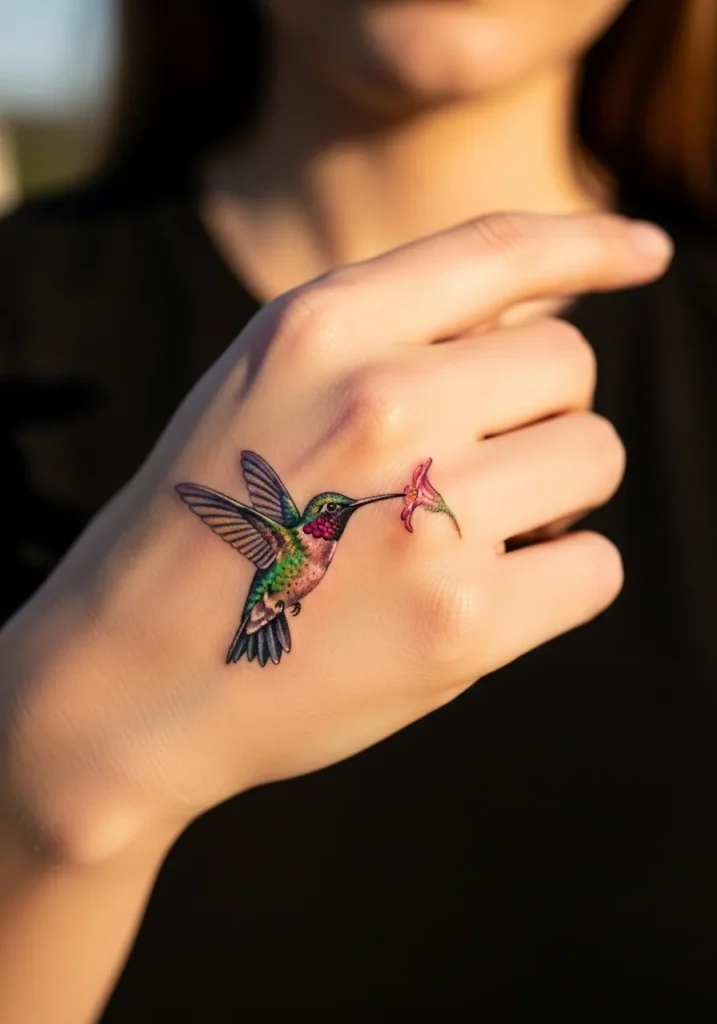 This delicate realism tattoo features a tiny hummingbird hovering near a soft pink flower, inked on the upper hand. The colors are vivid yet natural, blending greens, purples, and hints of gold to bring the bird to life. The fine detailing in the feathers and wings adds incredible movement, making it feel as if the bird is caught mid-flight.