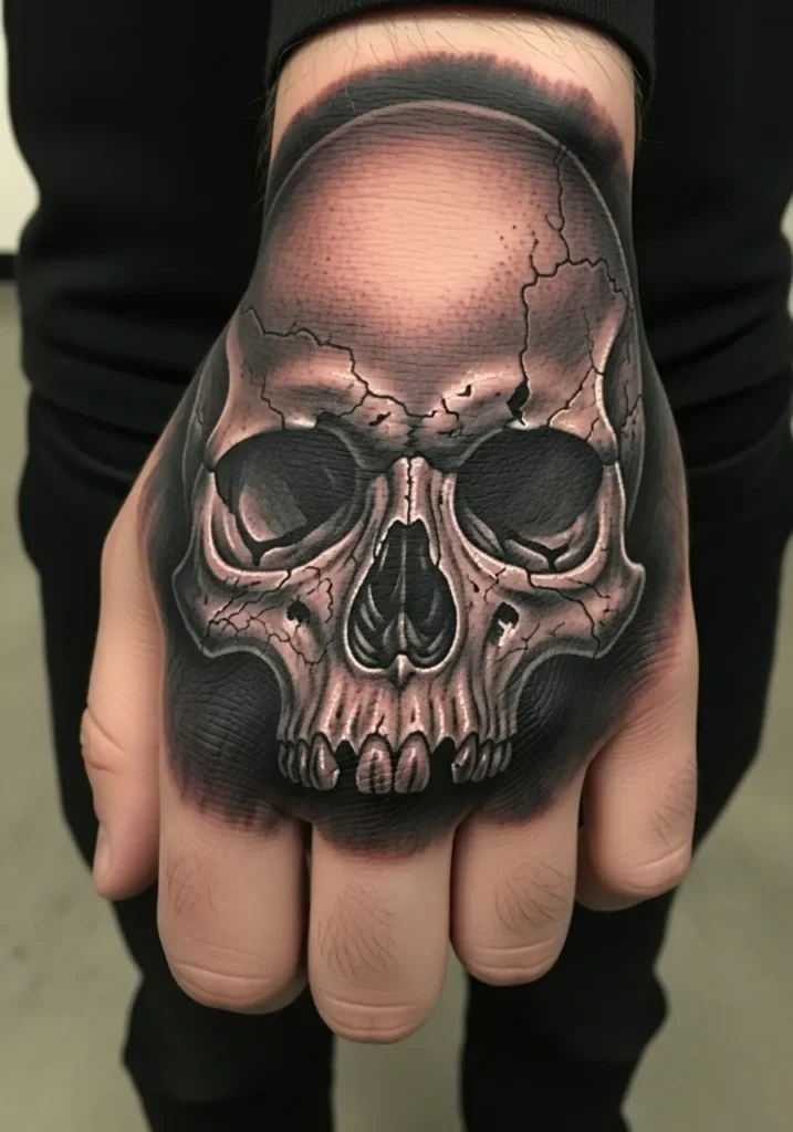 This bold hand tattoo features a lifelike skull shaded in deep tones of black and grey. The artist s precision in capturing cracks, shadows, and depth makes the skull look hauntingly realistic. The way it contours perfectly with the knuckles adds a powerful, masculine edge.