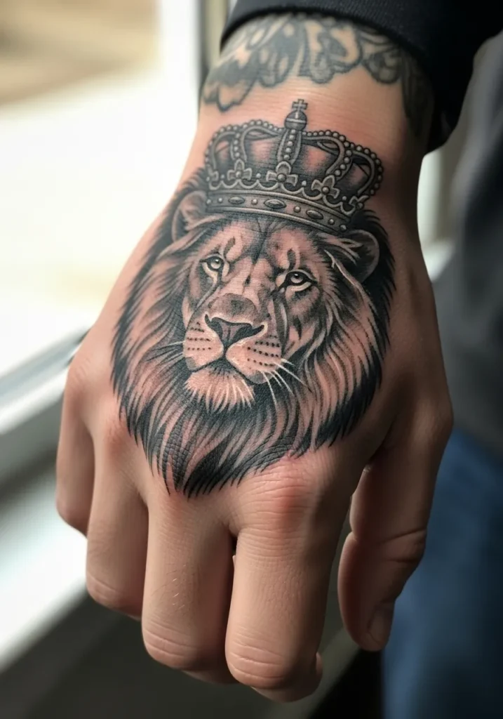 This majestic realism tattoo shows a lion wearing an ornate crown, covering the top of the hand. The detailed mane flows naturally, while the crown s delicate shading adds a regal touch. Every line and highlight contributes to a lifelike and commanding effect.