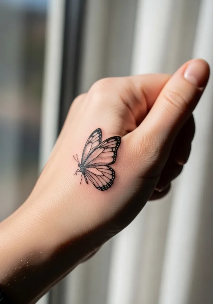This delicate butterfly sits lightly on the side of the hand, created in a fine line realism style. The wings are inked with soft black outlines and subtle shading, giving the illusion of movement and fragility. It s small, simple, yet beautifully refined.