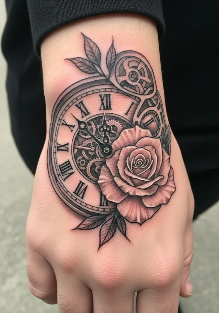 Here s a stunning mix of classic elements in a single design. A realistic clock paired with a soft-shaded rose covers the hand beautifully. The gears, Roman numerals, and precise shading make the timepiece look mechanical yet elegant, while the rose adds a romantic touch.