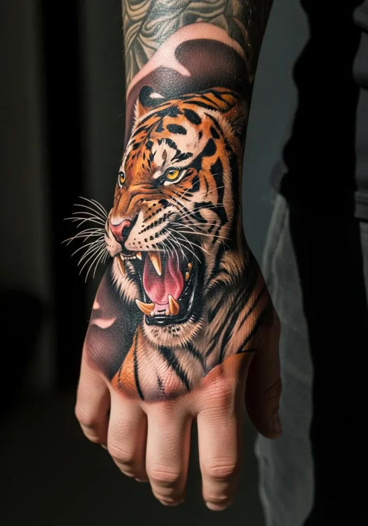 This fierce tiger tattoo looks almost alive, with its jaw open in mid-roar and eyes blazing in shades of amber. The hyper-realism work here is jaw-dropping the artist nailed the fur texture, color blending, and raw emotion behind that snarl. The placement across the hand enhances its power, as if the tiger s strength flows right through the wearer s fist.