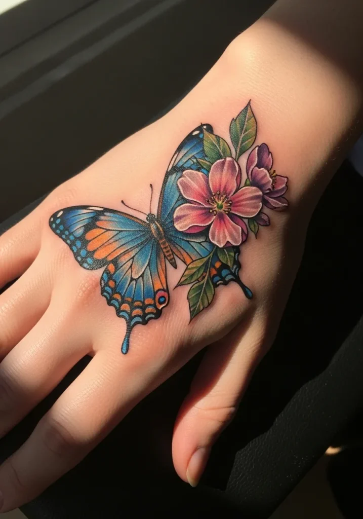 This vibrant realism tattoo captures a gorgeous blue butterfly perched beside delicate pink blossoms, resting gracefully on the top of the hand. The shades of deep blue, orange, and lilac pop beautifully against the skin, while the soft green leaves tie the whole piece together. Every detail, from the fine veins in the wings to the gentle petal textures, feels alive.