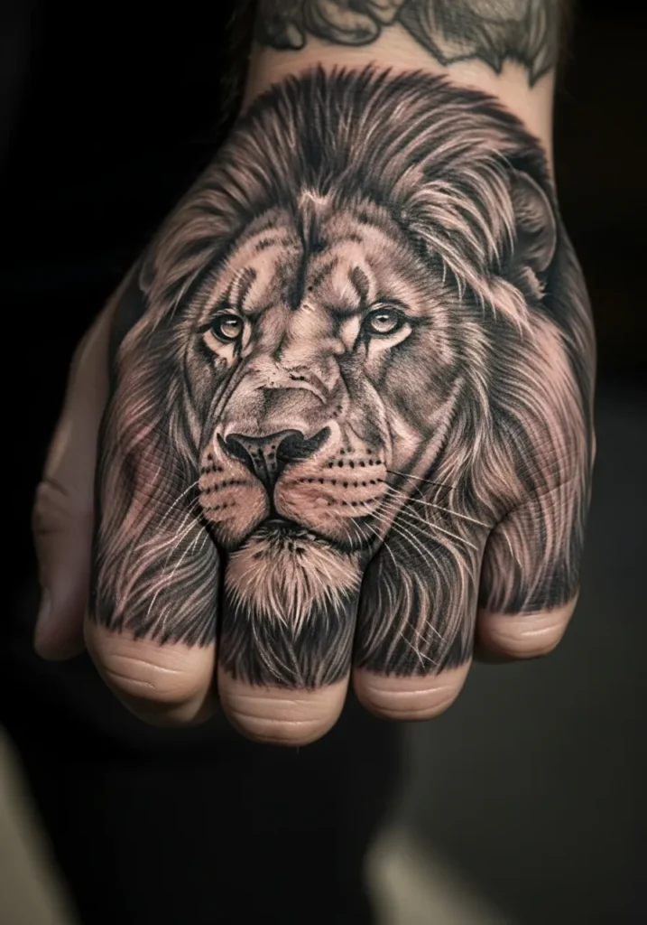 This realistic lion tattoo dominates the top of the hand with incredible detail and presence. The black-and-gray shading captures every strand of the lion s mane, every contour of its powerful face. The intensity in its eyes makes it feel like the king of the jungle is staring straight into your soul.