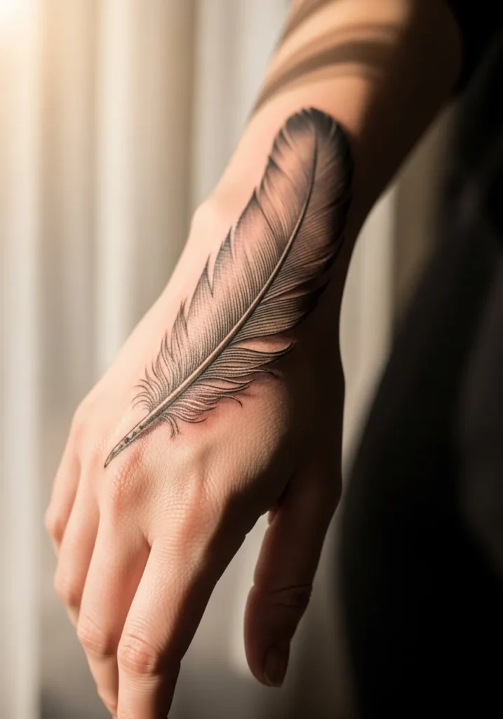 This delicate feather tattoo stretches gracefully across the back of the hand, following the natural curve of the skin. Its fine-line realism style captures every tiny barb and shadow, giving it the illusion of softness and motion. The artist s use of subtle shading creates a feather so detailed it almost looks like it could flutter away with a gentle breeze.